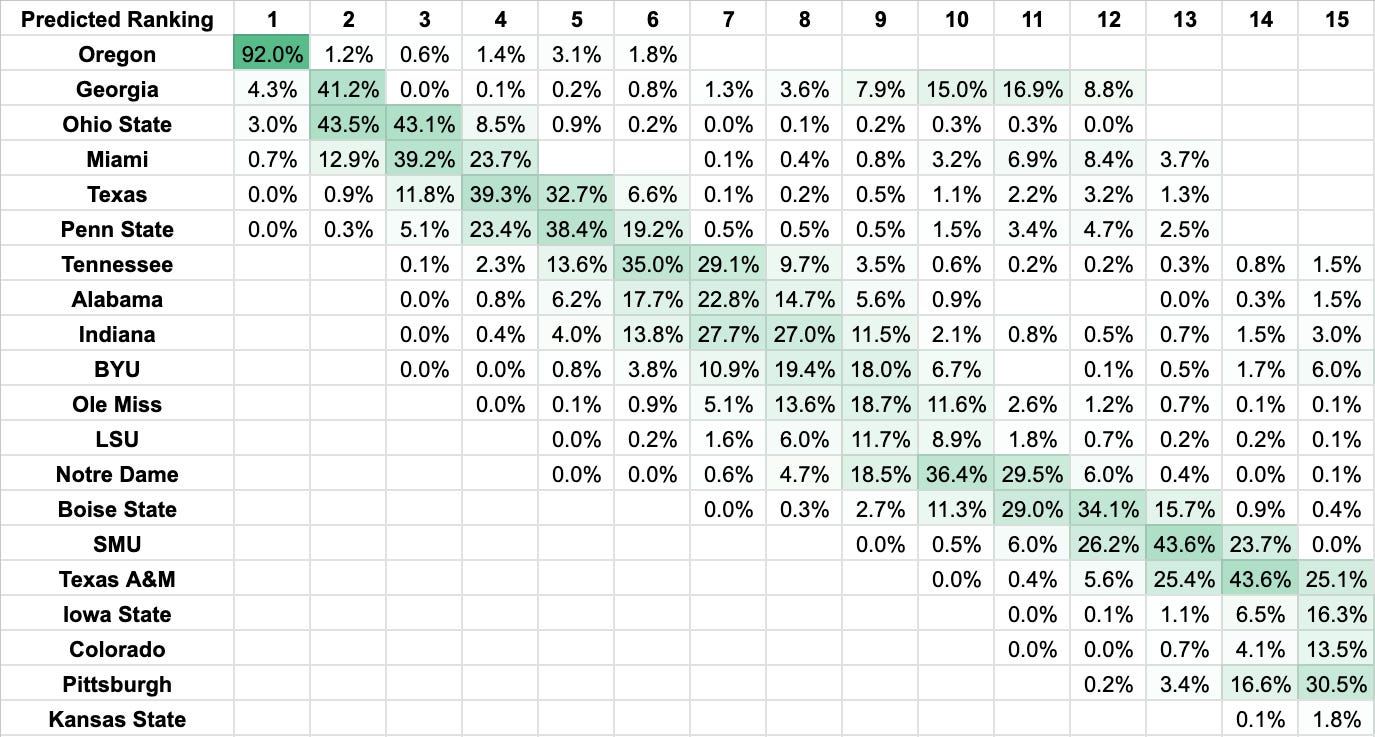 After 10,000 simulations using the Rankings Right Now algorithm trained on historical Playoff Committee rankings data, here were the percentage of time each team was ranked in a given spot after Week 11 going into the next Playoff Committee rankings.