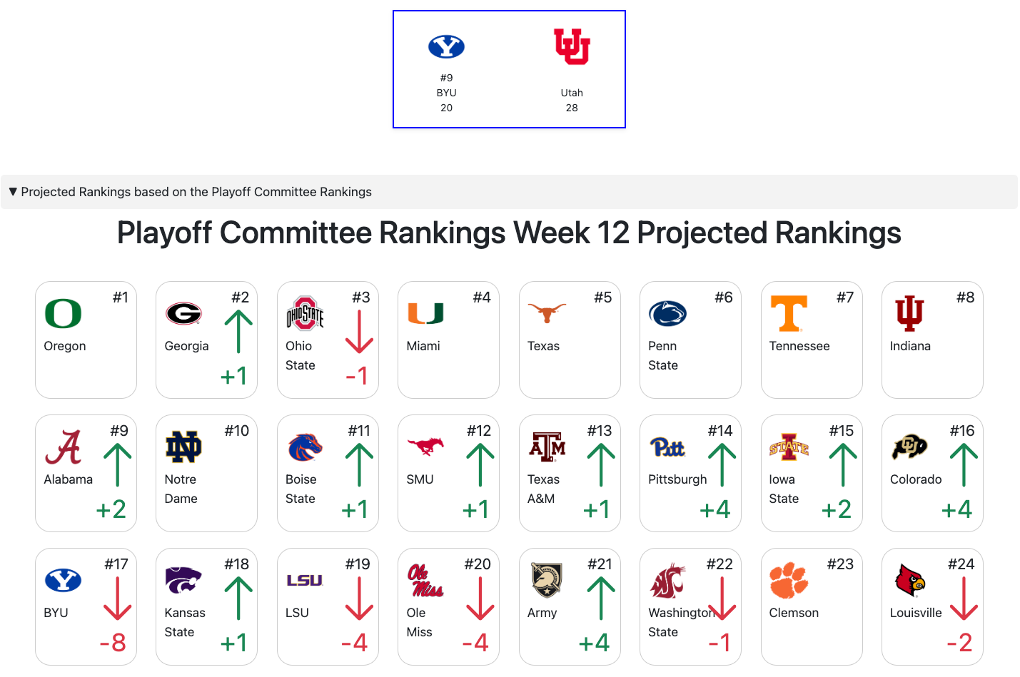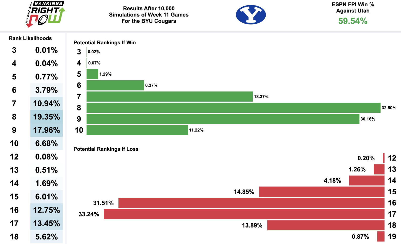 BYU is scorching hot and Utah has completely fallen off from where they’ve been in the last few years. BYU is a four point favorite in this game, and although I think BYU might run the score up in this rivalry game, Utah has had some surprises throughout the season. Once again using the What If simulation tool, if Utah can cause a huge upset and rush the field, it looks like it will be a tough fall for BYU all the way down to #18, right next to their Big 12 counterparts CU and Kansas State.