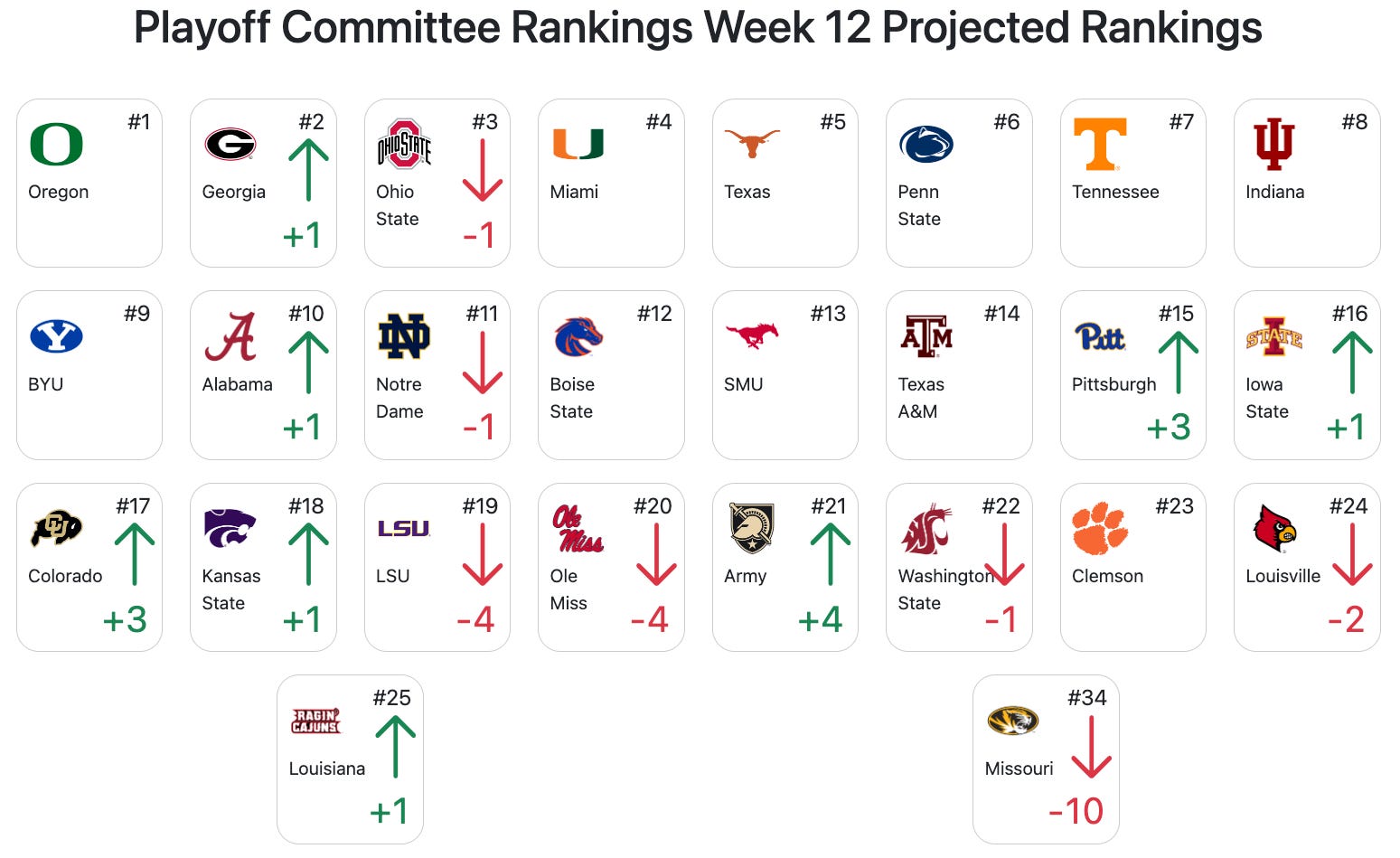 The most influential games of the weekend are happening down south. #3 Georgia vs #16 Ole Miss and #11 Alabama vs #15 LSU. The SEC has a lot of teams in the current 12 team college playoff after the first round of results, but there are some tough games on the schedule that could lead to some season knockouts.