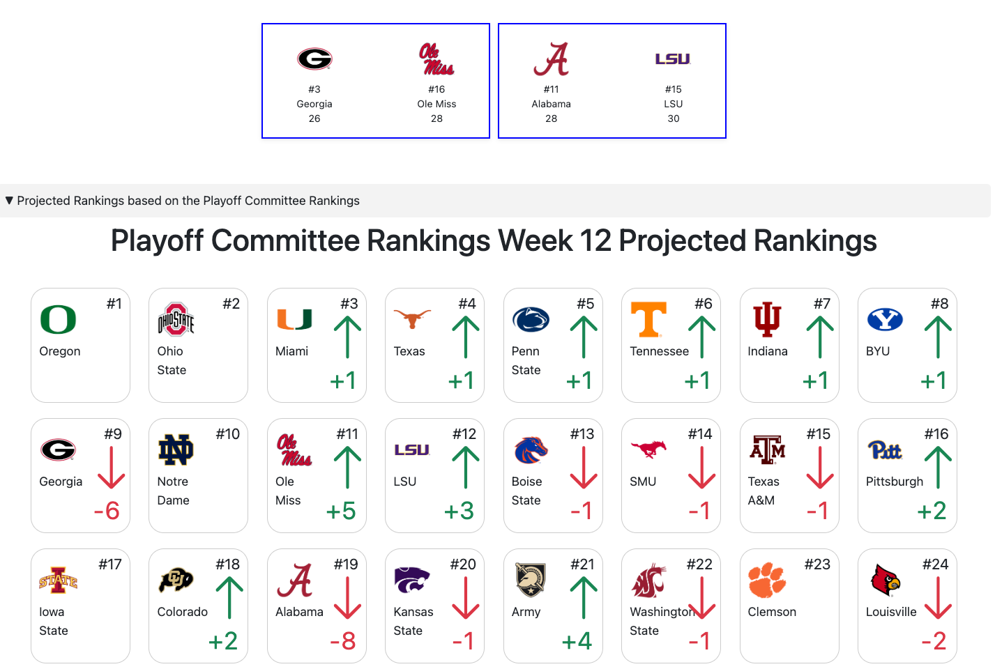 LSU with a solid win against Bama can only move up to 12 because of the blockage from Ole Miss. Another curious question is whether LSU and Ole Miss would be flipped there, with LSU beating Ole Miss at home earlier in the season