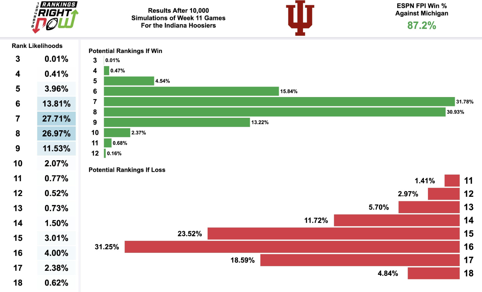 A lot of the reaction from the first release of the Playoff Committee had to do with BYU and Indiana, both teams who are undefeated, being ranked much lower than people would have thought. However, it’s not where you start but where you finish, and both teams have a good amount of ground they can make up. Here are the results of 10,000 simulations of Week 11 using the Rankings Right Now algorithm, and where both of those teams sit based on the results.